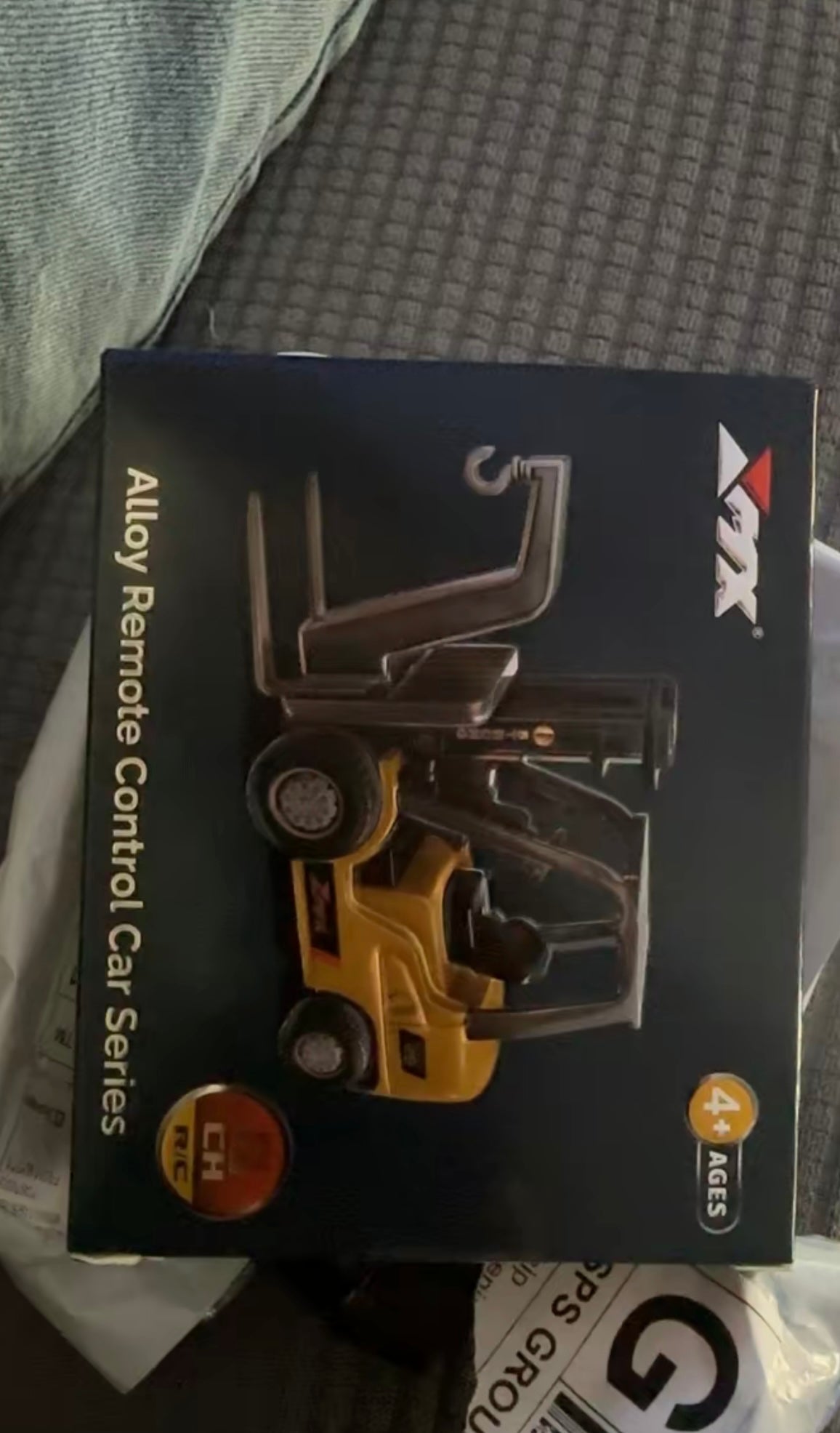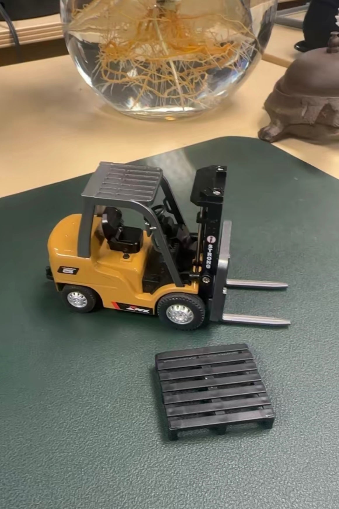 Mini forklift, 1 remote control, charging cable, cargo hook, and 2 pallets.